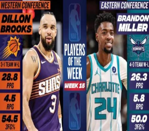 第一則:周最佳球員誕生 NBA官方公布了第15周的東西部周最佳球員,東部由黃蜂前鋒米勒當(dāng)選,西部由太陽(yáng)后衛(wèi)狄龍當(dāng)選。米勒上周場(chǎng)均砍下26.3分+5.8籃板+2.3助攻,命中率高達(dá)50%,帶領(lǐng)黃蜂隊(duì)取得4勝0負(fù)的戰(zhàn)績(jī)。據(jù)統(tǒng)計(jì),這是米勒生涯首次拿到周最佳。狄龍上周場(chǎng)均貢獻(xiàn)28.8分+4.5籃板+2.8助攻,投籃命中率53.5%,三分命中率高達(dá)54.5%,帶領(lǐng)太陽(yáng)隊(duì)取得3勝1負(fù)的戰(zhàn)績(jī)。據(jù)統(tǒng)計(jì),這也是狄龍生涯首次獲此殊榮。除此之外,騎士隊(duì)的阿倫、尼克斯隊(duì)的哈特、活塞隊(duì)的康寧漢姆、76人隊(duì)的恩比德、湖人隊(duì)的東契奇、火箭隊(duì)的杜蘭特、森林狼隊(duì)的華子、雷霆隊(duì)的亞歷山大和快船隊(duì)的小卡等球星獲得了周最佳提名。