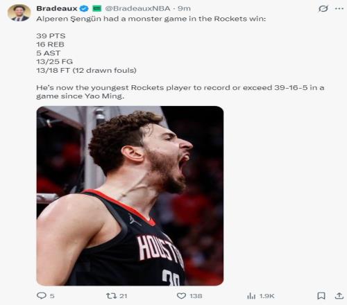 火記Bradeaux寫道,申京成為姚明后最年輕在一場比賽中至少39+16+5的球員。
