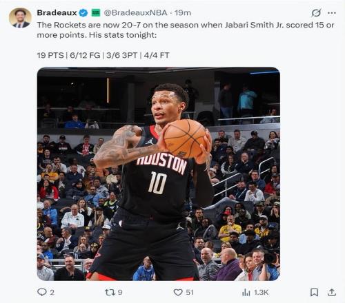 火記曬出小賈此役12中6+三分6中3拿到19分的數(shù)據(jù),他寫道:當本賽季小賈至少能拿到15分時火箭隊戰(zhàn)績20勝7負,看起來小賈也是火箭勝負晴雨表。