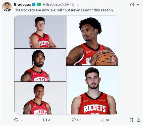 賽后火箭記者Bradeaux寫道,本賽季杜蘭特缺席的三場比賽火箭隊3勝0負,從這個層面來看火箭與杜蘭特是相互成就,火箭隊根本不是專業(yè)啃老的年輕球隊。