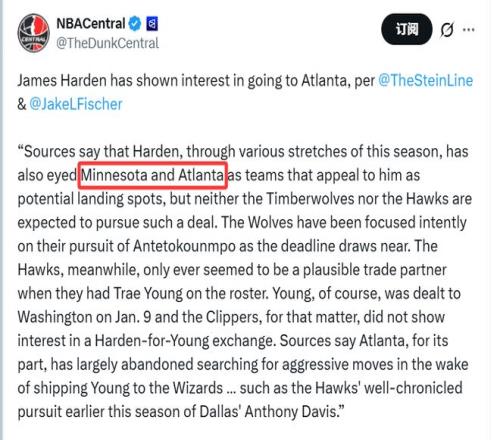 消息源透露,本賽季多個階段里,哈登都將森林狼與老鷹視為心儀的潛在下家,但森林狼與老鷹兩隊預計都不會推進相關交易。 隨著交易截止日臨近,森林狼正全力專注于追逐字母哥。至于老鷹,只有在特雷-楊仍在陣中時,才具備成為可行交易伙伴的可能性;而特雷-楊已于1月10日被交易至華盛頓奇才,快船方面也從未對哈登換特雷-楊的方案表現(xiàn)出興趣。消息源稱,在將楊送至奇才后,老鷹基本已放棄尋求重磅操作,這也包括本賽季初他們曾被廣泛報道的、追逐達拉斯獨行俠球員安東尼-戴維斯的相關計劃。