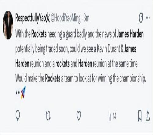 哈登可能重返休斯頓的消息出爐后,火箭球迷們紛紛發(fā)聲:火箭急需一名控球后衛(wèi),哈登即將被交易的消息傳出,我們有機(jī)會(huì)看到杜蘭特、哈登第三次攜手,如果這兩人在休斯頓重聚,我們有希望拿到總冠軍。