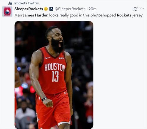 休媒SR寫(xiě)道:這張哈登“PS”的火箭球衣照片看起來(lái)他的狀態(tài)非常之好。