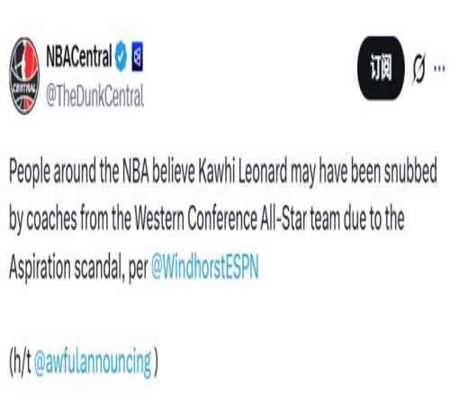 北京時間2月3日,據(jù)ESPN記者文霍斯特報道,NBA圈內(nèi)人士認(rèn)為,科懷-萊昂納德之所以未被教練選入西部全明星陣容,很可能是受到了陰陽合同的相關(guān)爭議事件的影響。賽季至今,萊昂納德場均貢獻(xiàn)27.6分、2次搶斷,兩項數(shù)據(jù)分列全聯(lián)盟第七與第一位。然而,在這場于他主場球館舉辦的全明星賽中,他卻沒能入選替補陣容。