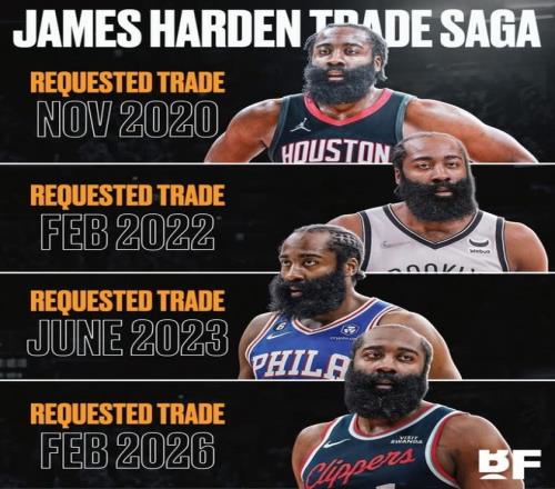 北京時間2月3日,根據(jù)名記Shams的報道,詹姆斯-哈登主動申請離開洛杉磯快船。隨后,美媒曬其四次申請交易圖:這哥們在哪都不開心