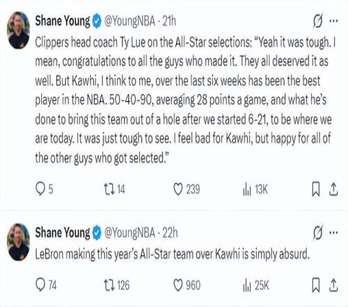 了解情況后,很多網(wǎng)友展開(kāi)了激烈的評(píng)論。 "小卡這數(shù)據(jù)還要啥自行車(chē)?場(chǎng)均27+6+3+2搶斷,比詹皇還多打4場(chǎng),落選全明星真是沒(méi)天理!" "全明星投票就是個(gè)笑話!教練選人看戰(zhàn)績(jī)不看表現(xiàn),快船前期擺爛拖累小卡,這鍋背得憋屈!" "詹姆斯能進(jìn)全明星我服氣,但小卡這表現(xiàn)硬生生被無(wú)視,聯(lián)盟是不是故意針對(duì)東道主???" "泰倫盧賽后那句話太憋屈了,科懷場(chǎng)均接近28分還難過(guò)?換詹姆斯早把教練罵懵了!" "建議聯(lián)盟改規(guī)則,全明星替補(bǔ)至少給東道主一個(gè)名額,不然誰(shuí)還愿意承辦這破比賽?" "小卡這賽季攻防一體,搶斷王+180俱樂(lè)部,落選真是侮辱人!詹姆斯數(shù)據(jù)能跟他比?" "快船官方用三個(gè)省略號(hào)鳴不平,這操作太心酸了,建議倫納德下次直接買(mǎi)斷去湖人!" "陰陽(yáng)合同的事兒要是真,小卡怕是連替補(bǔ)席都坐不穩(wěn),聯(lián)盟這波操作太惡心了!" "對(duì)比哈登落選,小卡更慘!至少哈登轉(zhuǎn)型組織能理解,小卡這狀態(tài)還落選真說(shuō)不過(guò)去!" "建議球迷集體請(qǐng)?jiān)高f補(bǔ)小卡,這波虧大了,明年全明星得給東道主留條活路!" "那么你覺(jué)得倫納德該不該遞補(bǔ)進(jìn)全明星?如果讓你投票,你會(huì)選他還是詹姆斯?評(píng)論區(qū)說(shuō)出你的理由!" 信源:NBA官網(wǎng) |