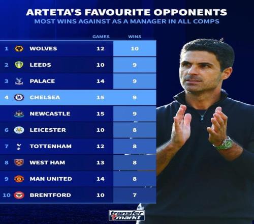 北京時(shí)間2月4日,在阿森納即將坐鎮(zhèn)主場(chǎng)迎來(lái)與切爾西的聯(lián)賽杯半決賽次回合比賽的情況下,德轉(zhuǎn)統(tǒng)計(jì)出了阿爾特塔教練生涯各項(xiàng)賽事贏球場(chǎng)次最多的對(duì)手,此前他率隊(duì)15次對(duì)陣藍(lán)軍取勝9場(chǎng)位列第4。