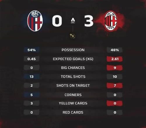 米蘭圈 北京時間2月4日凌晨3時45分,意甲第23輪,米蘭做客雷納托·達拉拉球場對陣博洛尼亞。上半場,奇克錯失單刀良機,隨后奇克破門首開記錄,恩昆庫點射擴大領(lǐng)先優(yōu)勢。米蘭半場2-0領(lǐng)先博洛尼亞。下半場,拉比奧特破門。最終米蘭3-0擊敗博洛尼亞,本賽季聯(lián)賽對博洛尼亞完成雙殺,米蘭已保持22輪不敗,繼續(xù)排名聯(lián)賽第二。 【比賽關(guān)鍵事件】 第20分鐘,阿特卡梅前場右路挑傳到禁區(qū)內(nèi),后點恩昆庫附身沖頂,球被門將撲出,隨后拉比奧特將球回敲,奇克迎球推射破門,米蘭1-0領(lǐng)先! 第36分鐘,恩昆庫接應(yīng)隊友的直塞,前插到禁區(qū)左側(cè)拿球被出擊的門將撲倒,主裁判指向點球點,隨后VAR介入,確認點球有效,恩昆庫主罰點球命中,2-0! 第48分鐘,博洛尼亞開出后場界外球,拉比奧特前插斷球得手,隨后拉比奧特突入禁區(qū)左側(cè)小角度低射破門,3-0!