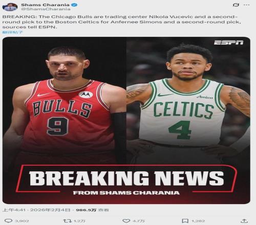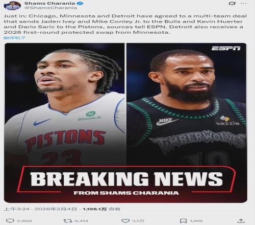 北京時間2月4日,距離本賽季交易截止日僅剩兩天,今天NBA一共達(dá)成4筆交易!先來說說活塞、公牛和森林狼的三方交易:活塞得到許爾特、薩里奇和2026年首輪互換權(quán)(來自森林狼);公牛得到艾維和康利;森林狼得到現(xiàn)金。