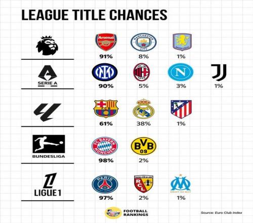雖然本賽季還有十幾輪才會結(jié)束,不過,在五大聯(lián)賽的對比各領(lǐng)跑者的姿態(tài)是越發(fā)的明確了。就此,數(shù)據(jù)機(jī)構(gòu)EuroClubIndex也是給出了預(yù)測,就五大聯(lián)賽奪取獎杯的幾率給出計算。 其中,英超方面是十分激烈的也是牽動人心的。不過,在這幾輪比完后奪冠情況越發(fā)明朗了。目前,阿森納的奪冠概率達(dá)到了91%,曼城只有8%,阿斯頓維拉只有1%。后兩者相加幾乎可忽略不計了,阿森納正在逼近自己的多賽季來的第一座獎杯。很顯然,他們的陣容深度及比賽表現(xiàn)讓人信服的,特別是在對手們主動掉鏈子基礎(chǔ)上,他們穩(wěn)住了。 按著阿森納這套班底及財政狀況,如果他們本賽季奪冠打破荒蕪,那么,是有機(jī)會開啟接下來的統(tǒng)治模式的。