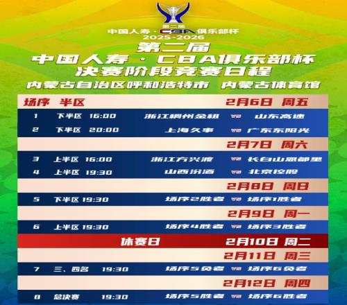 2月8日 19:30 半決賽1(下半?yún)^(qū)勝者)浙江/山東 vs 上海/廣東 —— 誰(shuí)能率先挺進(jìn)決賽? 2月9日 19:30 半決賽2(上半?yún)^(qū)勝者)廣廈/吉林 vs 山西/北控 —— 另一席決賽名額,花落誰(shuí)家? 2月10日 休賽日短暫喘息,為終極對(duì)決蓄力。 2月11日19:30 三四名決賽敗者之爭(zhēng),尊嚴(yán)之戰(zhàn)。 2月12日 19:30 決賽冠軍誕生!
