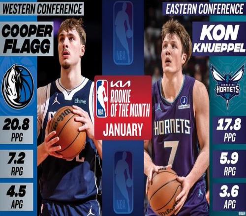 黃蜂的克努佩爾與獨(dú)行俠的弗拉格分別當(dāng)選1月東西部月最佳新秀。 在1月,弗拉格場均20.8分7.2籃板4.5助攻;克努佩爾場均17.8分5.9籃板3.6助攻。 這也是這兩位來自杜克的新秀連續(xù)3個(gè)月當(dāng)選月最佳新秀。 其他提名: 西部:貝利(爵士)、考沃德(灰熊)、樂福(開拓者)、奎因(鵜鶘) 東部:杰明(籃網(wǎng))、埃奇庫姆(76人)、特雷-約翰遜(奇才)、博伊爾斯(猛龍) 月最佳防守球員:文班亞馬和奧薩爾-湯普森