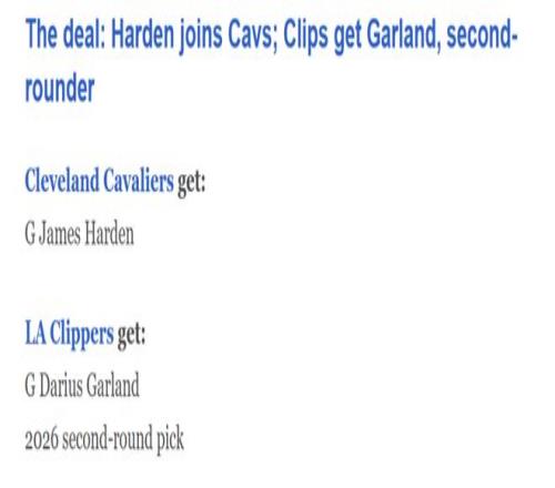 哈登2換1交易敲定 在傳出哈登向快船提出交易申請后不到24小時(shí),快船與騎士便迅速圍繞哈登與加蘭完成2換1交易,具體內(nèi)容為: 騎士得到:哈登; 快船得到:加蘭+一枚2026年次輪簽。