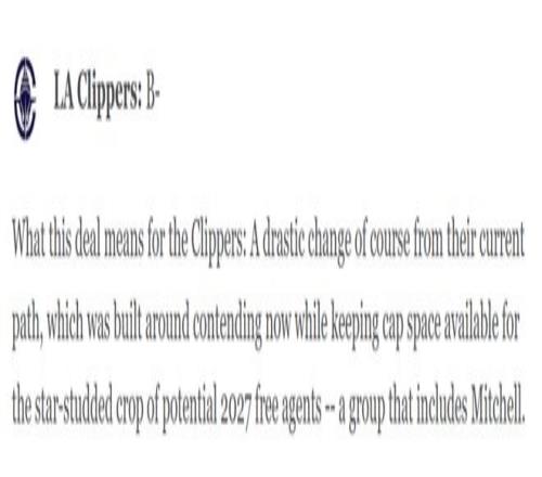 至于快船隊(duì)一直非常在乎的27年薪金空間,交易也不會帶來太大影響,因?yàn)槟壳翱齑?duì)名單中只有祖巴茨與加蘭在27年后還會留在陣容中,屆時(shí)快船仍可以拿出頂薪空間追求像米切爾這樣的潛在大牌球員。 唯一的風(fēng)險(xiǎn)是加蘭的傷病問題與矮小的身材,這也是他們僅拿到B-的原因,但快船在如此艱難的困境中找到一條看起來是兩全的策略已經(jīng)實(shí)屬不易。