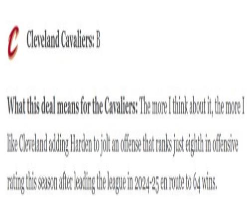 哈登1換2交易評分出爐兩隊(duì)雙贏!騎士交易后可進(jìn)可退獲B評分,快船困境中找到兩全之策同樣拿下不錯的B-評分。