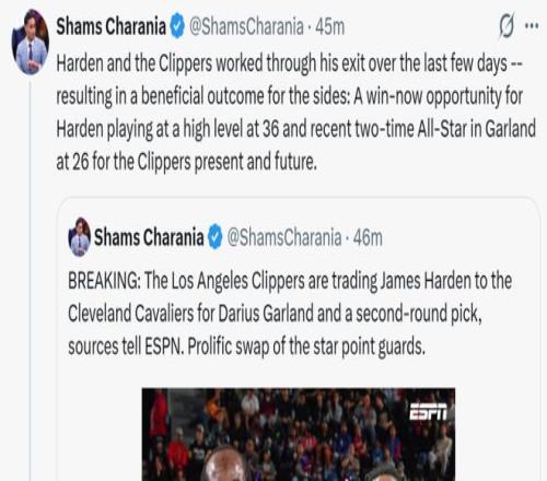 放棄230萬促成2換1交易 根據(jù)ESPN名記Shams報道,快船與騎士圍繞加蘭和哈登達(dá)成2換1交易,兩人順利完成互換,具體方案如下: 快船得到:加蘭+一枚次輪簽; 騎士得到:哈登。
