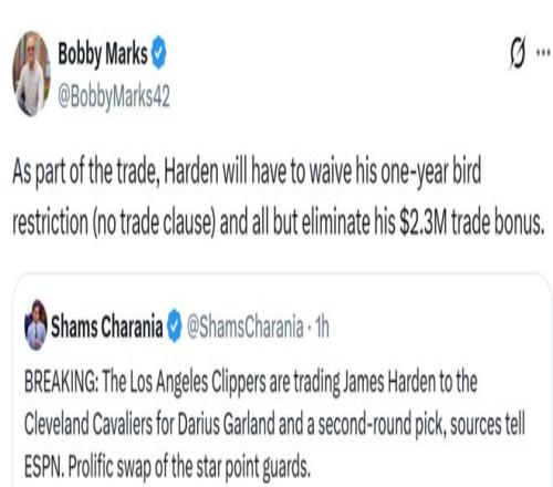 后續(xù)ESPN薪資專家Bobby Marks跟進(jìn)表示,為了促成交易哈登不得不放棄交易否決權(quán),也因此放棄了約230萬美元的交易保證金(15%)。