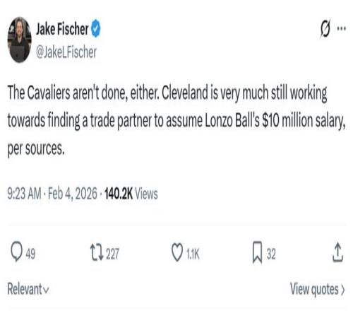 名記Jake Fischer就在哈登交易后第一時間曝出,騎士隊的運作還沒有結(jié)束。 他們將繼續(xù)圍繞大球進(jìn)行補強,本賽季他身背1000萬美元合同,下個賽季為1000萬的球隊選項。