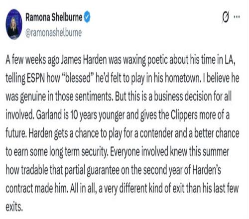 除了爭冠這一固定的主線任務(wù)之外,美記Ramona Shelburne也在后續(xù)報道中指出,這一次哈登離隊與此前幾次不同的一點是他希望能夠在騎士得到一份長期保障性續(xù)約合同。 去年夏天他與快船隊簽下了一份1+1價值8150萬美元的合同,26-27賽季4232萬美元的球員選項中僅有1332萬美元受到保障。 哈登團隊曾向快船報價2年8000萬美元結(jié)果被拒,這也是哈登最終下定決心提出交易申請的關(guān)鍵。