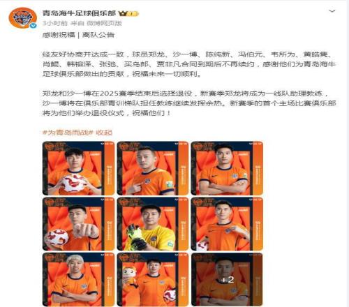 2月4日,青島海牛俱樂部官宣,鄭龍、沙一博、陳純新、馮伯元、韋所為、黃皓雋、肖鯤、韓镕澤、張弛、買烏郎、賈非凡合同到期不再續(xù)約,海牛俱樂部祝他們未來一切順利。鄭龍、沙一博選擇退役,其中,鄭龍將成為海牛一線隊(duì)助理教練,沙一博將在俱樂部青訓(xùn)梯隊(duì)擔(dān)任教練發(fā)。 |