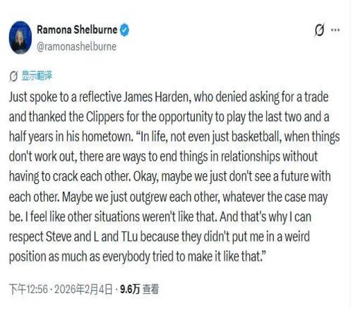 過去6年,哈登輾轉(zhuǎn)多支球隊,大部分情況下,他都是主動提出交易申請,但這一次故事似乎有不同的劇本。 6年4次交易,哈登這次為何放棄“落葉歸根” 其實就在兩周前,哈登還在談?wù)撝穆殬I(yè)生涯最后階段能夠為家鄉(xiāng)球隊打球是“多么幸運的一件事”。彼時,在媒體的鏡頭下,找回“第二春”的哈登和正在重回正軌的快船,就像是一對重回甜蜜期的戀人。 事實上,根據(jù)美國多家媒體的報道,哈登在洛杉磯的這幾個賽季確實很受歡迎,相對于他此前在76人打出的數(shù)據(jù),如今的哈登已經(jīng)遠遠超出了球迷的預(yù)期。而哈登對于這支球隊也投入了感情,據(jù)快船跟隊記者報道,哈登在幫助快船塑造球隊文化方面付出了很多,他慷慨地向眾多球員、工作人員甚至是媒體成員贈送自己的球鞋,而且盡心盡力照顧那些被他邀請到主場的球迷。 相比于曾經(jīng)在火箭時期被描述為“球霸”,以及在籃網(wǎng)和76人與球隊管理層的矛盾,如今的哈登和快船寫下的這段“落葉歸根”的故事原本看起來非常甜蜜,那么,他為什么在過去6年里決定第四次“主動提出交易申請”,親手掐斷了自己和家鄉(xiāng)球隊的羈絆? 據(jù)美國媒體ESPN報道,球隊與哈登在續(xù)約合同方面的分歧,成了哈登的心結(jié)——哈登目前持有的是一份為期兩年、價值8150萬美元的合同,于去年夏天簽署,其中2026-2027賽季的部分保障金額為1330萬美元;而快船隊目前一直優(yōu)先考慮2027年夏季的薪資空間,不愿提供超出2026-2027賽季的球員合同金額來續(xù)約哈登;消息人士稱,即將37歲的哈登原本希望在本賽季后獲得一份為期兩年、全額保障、價值8000萬美元的合同,但快船隊始終堅持不愿將合同延長至2027年之后。 另一方面,據(jù)其他多家美國媒體分析,快船也在為有可能出現(xiàn)的聯(lián)盟處罰做準備,如果NBA聯(lián)盟在調(diào)查倫納德和涉嫌欺詐的破產(chǎn)碳中和公司Aspiration的贊助合同時認定存在問題,那么快船很可能將失去多個選秀權(quán),彼時,年輕化的核心陣容就顯得相當重要。這或許也是為什么在哈登提出交易之后,快船愿意用這位老將換取一個存在傷病隱患和恢復(fù)不確定性但是年輕10歲的加蘭。