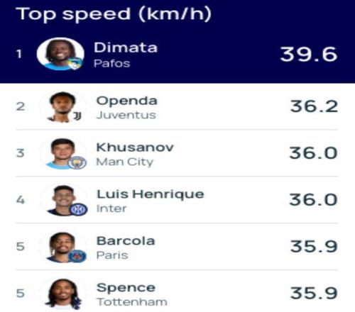 第三個(gè),28歲的迪馬塔應(yīng)該是中超速度最快的球員了。本賽季他在歐冠就創(chuàng)造了39.6公里每小時(shí)的沖刺速度,排在本賽季歐冠沖刺速度第一名,斷崖式領(lǐng)先,甚至不輸一些短跑運(yùn)動(dòng)員,堪稱(chēng)“足壇博爾特”,來(lái)中超這速度就是降維打擊了。