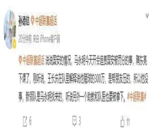 剛剛,媒體人孫德信在個(gè)人社交賬號(hào)上發(fā)文稱,北京國(guó)安新任體育總經(jīng)理馬永明今天開會(huì)追責(zé)了國(guó)安被罰分一事,最終結(jié)果是領(lǐng)隊(duì)隋東亮下課,而王長(zhǎng)慶因在解釋之后則沒有事。此外,孫德信稱還有一位助理教練和隊(duì)醫(yī)也要被拿下。