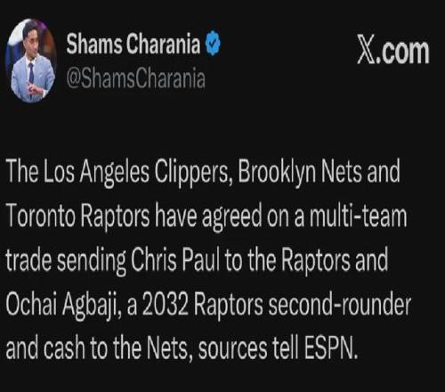 來了,三方大交易,如下: 猛龍得到保羅; 籃網(wǎng)得到阿巴基+猛龍32年次輪簽+部分現(xiàn)金(來自快船,350萬美元); 快船得到19屆次輪第30順位秀馬林科維奇的簽約權(quán)。