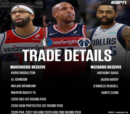 雙方達成的具體交易為:獨行俠送出安東尼戴維斯+杰登哈迪+德安吉洛拉塞爾+丹特??怂_姆,從奇才換回克里斯米德爾頓+AJ約翰遜+馬拉凱布蘭納姆+馬文巴格利+2026年首輪簽(來自雷霆)+2030年受保護首輪簽(來自勇士)+2026年次輪簽(來自太陽)+2027年(來自公牛)+2029年次輪簽(來自火箭)。