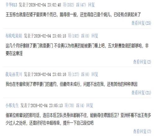北京時(shí)間2月4日晚上,據(jù)媒體人盧基琳的最新爆料,稱一家德甲豪門冬窗向王鈺棟發(fā)出誠(chéng)意邀約,但最終未成行,具體信息是:“現(xiàn)在轉(zhuǎn)會(huì)窗關(guān)了,U23國(guó)足的比賽也結(jié)束了,可以說(shuō)一下了,在這個(gè)冬窗,一家德甲豪門俱樂(lè)部給王鈺棟發(fā)出了邀約,還是帶著誠(chéng)意的,有轉(zhuǎn)會(huì)費(fèi),也有對(duì)未來(lái)的規(guī)劃,不過(guò)最終還是沒(méi)有成行,問(wèn)題不出在王鈺棟,還有其他的種種原因。” 對(duì)此,國(guó)內(nèi)球迷紛紛熱議這一則消息:
