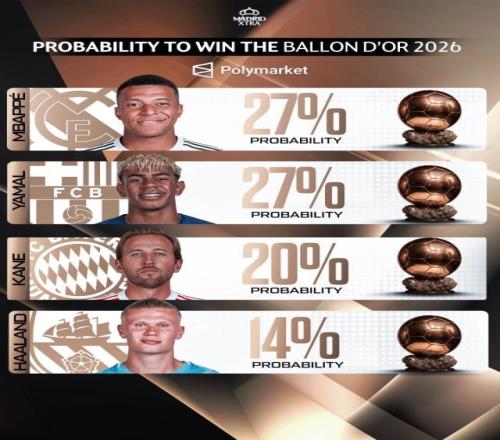 02月04報(bào)道 相關(guān)機(jī)構(gòu)近期更新了2026年金球獎的獲獎概率預(yù)測,目前姆巴佩與亞馬爾并列領(lǐng)跑,兩人獲獎概率均為27%,凱恩和哈蘭德則緊隨其后。 2026年金球獎獲獎概率: 1、姆巴佩、亞馬爾:27% 2、凱恩:20% 3、哈蘭德:14% 4、貝林厄姆:6% 5、維尼修斯:5% 今日(2.5) 08:00 NBA常規(guī)賽 掘金 - 尼克斯 08:30 NBA常規(guī)賽 森林狼 - 猛龍 09:00 NBA常規(guī)賽 凱爾特人 - 火箭 09:00 NBA常規(guī)賽 鵜鶘 - 雄鹿 10:30 NBA常規(guī)賽 雷霆 - 馬刺 11:00 NBA常規(guī)賽 灰熊 - 國王 11:30 NBA常規(guī)賽 騎士 - 快船 13:00 斯諾克世界大獎賽第2輪 肖國棟 - 奧沙利文 15:00 足球友誼賽 中國男足U19 - 烏茲別克斯坦U19 17:00 亞洲羽毛球團(tuán)體錦標(biāo)賽男團(tuán)小組賽 中國男團(tuán) - 泰國男團(tuán) 19:00 斯諾克世界大獎賽第2輪 趙心童 - 塞爾比 21:30 足球友誼賽 阿克倫托格里蒂 - 浙江 明晨(2.6) 01:30 沙特聯(lián)第21輪 吉達(dá)國民 - 哈森姆 01:30 沙特聯(lián)第21輪 阿科多 - 利雅得新月 02:30 冬奧會單板滑雪大跳臺預(yù)賽第1輪 蘇翊鳴 - 單板滑雪 03:15 冬奧會單板滑雪男子大跳臺預(yù)賽第2輪 蘇翊鳴 - 單板滑雪 04:00 法國杯1/8決賽 斯特拉斯堡 - 摩納哥 04:00 意杯1/4決賽 亞特蘭大 - 尤文圖斯 04:00 國王杯1/4決賽 皇家貝蒂斯 - 馬德里競技 04:00 冬奧會單板滑雪男子大跳臺預(yù)賽第3輪 蘇翊鳴 - 單板滑雪 04:45 葡杯1/4決賽 葡萄牙體育 - AVS俱樂部 07:00 巴甲第2輪 桑托斯 - 圣保羅 |
