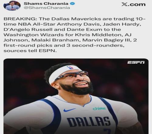 哇塞,太瘋狂了。 爆料王Shams:獨(dú)行俠將濃眉哥+拉塞爾+哈迪+埃克薩姆送至奇才,換回米德?tīng)栴D+AJ-約翰遜+布蘭納德+巴格利+2個(gè)首輪簽+3個(gè)次輪簽。