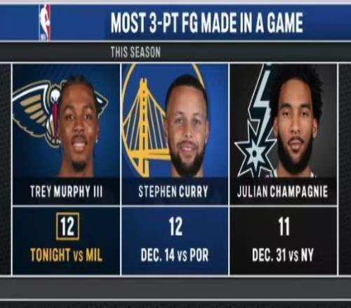 數(shù)據(jù)統(tǒng)計(jì) 雄鹿:科菲16分,特納16分9籃板,格林6記三分20分,羅林斯27分,波特18分6籃板9助攻5搶斷,特倫特13分,南斯4記三分16分。 鵜鶘:墨菲12記三分44分6籃板6助攻3搶斷,三分命中數(shù)與得分均創(chuàng)生涯新高紀(jì)錄,追平庫(kù)里并列本賽季單場(chǎng)三分命中數(shù)聯(lián)盟第一。貝4記三分22分,錫安20分5籃板8助攻,費(fèi)爾斯13分。