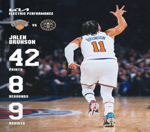 不過,穆雷在末節(jié)和加時(shí)賽接連得分,幫助掘金將比賽拖入到了第二個(gè)加時(shí)。未能擊敗對(duì)手,穆雷只能飲恨。數(shù)據(jù)顯示,穆雷自進(jìn)入26年后場(chǎng)均27.7分,控衛(wèi)第三高,僅次于東契奇(33.2分)和亞歷山大(32.1分)。看來,本賽季的穆雷入選全明星確實(shí)是實(shí)至名歸。 布倫森42+8+9暴走 尼克斯隊(duì)當(dāng)家球星杰倫布倫森,在此戰(zhàn)強(qiáng)勢(shì)暴走。布倫森出戰(zhàn)47分鐘,27投14中,三分12中5,罰球11中9,狂轟42分8籃板9助攻2搶斷,正負(fù)值+13。布倫森以51.9%的命中率轟下了全場(chǎng)的最高分,他還投進(jìn)了全場(chǎng)最多的5記三分球。作為全隊(duì)罰球次數(shù)最多的球員,布倫森在進(jìn)攻端求勝欲望極強(qiáng)。 布倫森暴走