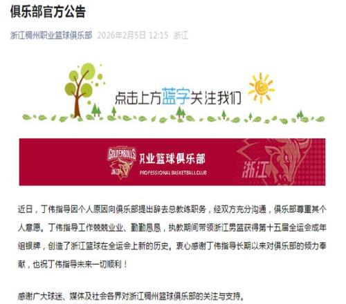 北京時間2月5日,在2025年12月25日,浙江男籃官方發(fā)布公告,表示主帥丁偉轉任俱樂部男籃總教練。如今浙江男籃再度發(fā)布公告,丁偉指導因個人原因向俱樂部提出辭去總教練職務,經雙方充分溝通,俱樂部尊重其個人意愿。