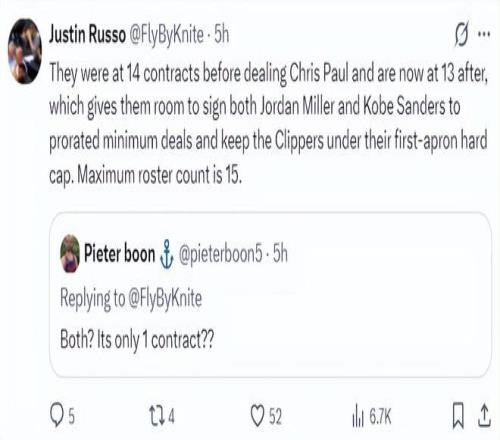 快船隊(duì)一直有意將桑德斯、喬丹米勒兩位雙向合同球員的合同轉(zhuǎn)為正式合同,送走保羅后大名單只剩下13人正好可以轉(zhuǎn)正這兩位出色的年輕小將。而且喬丹-米勒、科比-桑德斯兩人的合同會(huì)轉(zhuǎn)為最低的新秀合同,這樣快船可以保持在第一奢侈稅征點(diǎn)之內(nèi)。 |