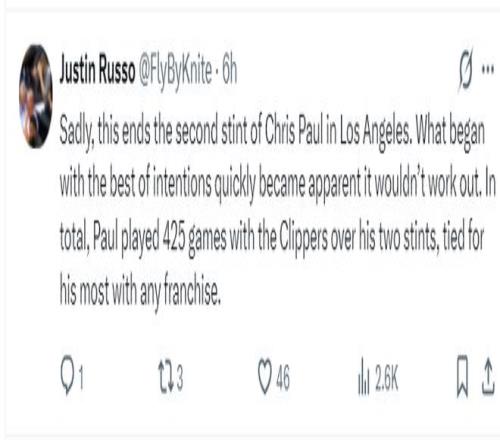 這筆交易發(fā)生后,快船記者Justin Russo寫(xiě)道:保羅在快船的生涯就此終結(jié),令人遺憾。起初雙方都希望朝著理想的方向發(fā)展,但很快彰顯出矛盾無(wú)法延續(xù)下去。保羅職業(yè)生涯為快船出戰(zhàn)425場(chǎng)比賽,這一數(shù)字是他效力過(guò)的任何球隊(duì)中最高紀(jì)錄。