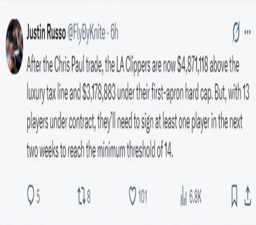 跟對(duì)于快船來(lái)說(shuō)送走保羅利好太多了,保羅的交易完成后,快船的總薪資超出奢侈稅線4871118美元低于硬帽3178883美元,快船目前保障名單只有13份,球隊(duì)需要在兩周內(nèi)簽下一人滿(mǎn)足聯(lián)盟最低14份保障名單的最低門(mén)檻。