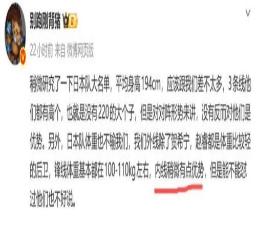 日前,日本籃協(xié)公布了世預賽的集訓名單,對此媒體人別跑剛背豬發(fā)文表示:“日本平均身高1米94,和中國男籃差不太多,但中國男籃有內線優(yōu)勢?!?/p>