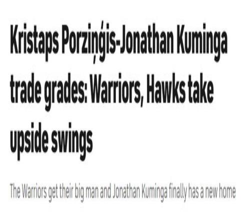 庫明加2換1交易評級:勇士引進打折版波神評B老鷹補強鋒線也評B