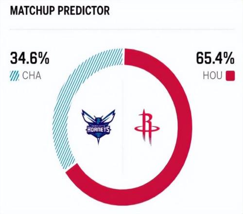 這是兩隊本賽季的首次交鋒,在兩隊隊史的71次交手中,火箭取得51勝20負(fù)的戰(zhàn)績,勝率高達(dá)71.8%,優(yōu)勢非常明顯。 賽前,美媒ESPN對本場比賽進(jìn)行了勝率預(yù)測,火箭隊勝率高達(dá)65.4%,黃蜂勝率則僅有34.6% ,差距還挺明顯。
