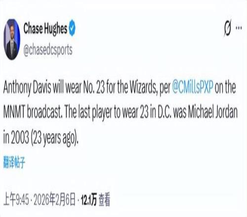北京時(shí)間2月6日,奇才和獨(dú)行俠的交易官宣,安東尼-戴維斯正式成為一名奇才球員。奇才隊(duì)記Chase Hughes報(bào)道稱(chēng),濃眉來(lái)到奇才將改穿23號(hào)球衣,而上一位在奇才穿23號(hào)球衣的球員,已經(jīng)追溯到23年前的邁克爾-喬丹(2003年)。