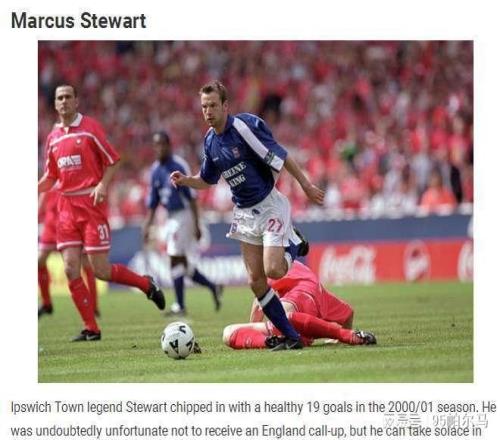 福禍相依,伊普斯維奇提供了兩個極端版本。 2000-01賽季,英超升班馬伊普斯維奇變成了大黑馬,匪夷所思的拿到了英超第5的佳績,并且“拖拉機男孩們”久違地拿到了聯(lián)盟杯入場券。 “小球隊闖進了豪門圈子”,這是《衛(wèi)報》的點評。 在論功行賞時,原本將走之人斯圖爾特記頭功,他在34場比賽中打進了19球,對陣利物浦打進了制勝球,對陣南安普頓上演過帽子戲法,最終在射手榜上僅次于哈塞爾巴因克。 考慮到27歲才踢英超,這個完美的處子賽季支撐起了「天道酬勤」的話題,英國媒體甚至呼吁三獅軍團為斯圖爾特提供一次當國腳的機會。 當時有人將斯圖爾特與另一個草根射手凱文·菲利普斯相提并論,甚至用現(xiàn)在的眼光看,伊普斯維奇前鋒身上有瓦爾迪1.0版本的模樣。