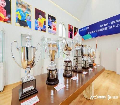香江1號正在展出的七座世乒賽冠軍獎杯。 作為2008北京奧運會和2025全國殘?zhí)貖W會的火炬手,香江1號藝術總顧問翟美卿的兩件專屬火炬,在此次特展中特別展出。