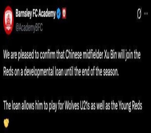 北京時(shí)間2月6日,狼隊(duì)官方宣布中國(guó)球員徐彬正式租借加盟巴恩斯利。但從巴恩斯利官方公告與巴恩斯利官網(wǎng)信息來看,徐彬?qū)嶋H上加入的是巴恩斯利的U21青年隊(duì)。