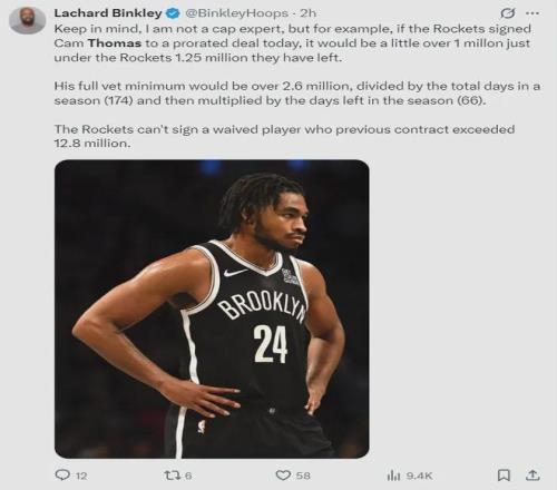 隊(duì)記Binkley對(duì)此分析道,由于火箭目前僅低于第一硬帽125萬(wàn)美元,倘若真的要簽下托馬斯,那么后者的薪資最高不超過(guò)125萬(wàn)美元,而競(jìng)爭(zhēng)者們能夠給出更高的價(jià)錢(qián)。