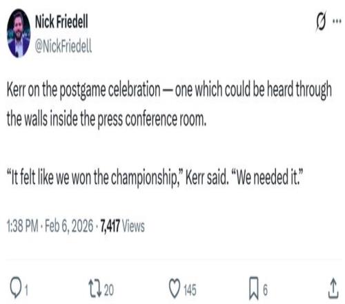 雖然對(duì)球隊(duì)排名影響不大,但對(duì)于處于下行勢頭的勇士隊(duì)來說,這一場含金量十足的勝利無異于一劑強(qiáng)心針。 正如科爾賽后所說:“賽后全隊(duì)都在更衣室中慶祝,就好像我們贏了總冠軍一樣,我們真的太需要這場勝利了?!?/p>