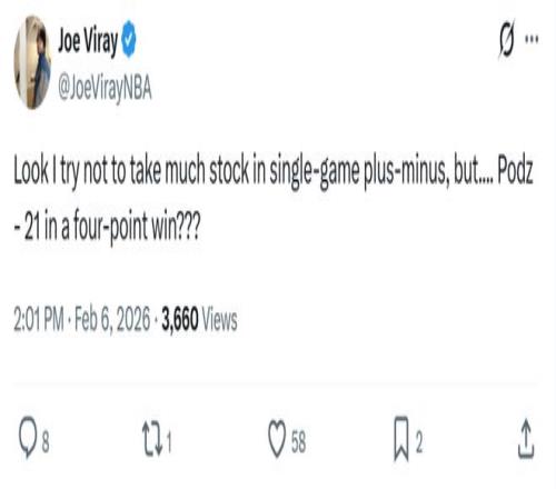 波杰的表現(xiàn)更加糟糕,3投0中沒有得分入賬,僅拿到3板1助,在球隊(duì)贏球的情況下正負(fù)值-21全場最差,關(guān)鍵時(shí)刻同樣被DNP。 面對(duì)波杰這樣的表現(xiàn),勇士記者Joe Viray賽后都不禁吐槽道:“我一般不在意正負(fù)值,但波杰在球隊(duì)贏了4分的情況下,正負(fù)值竟然為-21?”