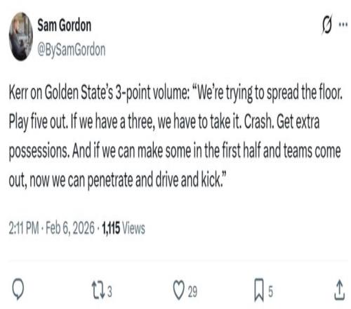 半場37記三分破紀(jì)錄 而勇士隊(duì)之所以能夠拿下勝利,主帥科爾的變陣與用人成為關(guān)鍵,半場瘋狂出手37記三分創(chuàng)造NBA歷史紀(jì)錄,半場在籃下0-3英尺僅出手5次,只造成了一次投籃犯規(guī),可謂是將對(duì)于三分投射的依賴發(fā)揮到了極致。 賽后科爾也對(duì)這一點(diǎn)做出解釋:“我們正在努力拉開空間,采取五外陣容,只要有機(jī)會(huì)出手三分,我們就必須堅(jiān)決出手,然后積極拼搶籃板,爭搶更多球權(quán),只有半場命中更多三分,對(duì)手的防守才會(huì)更靠外,這樣我們就可以突破、切入和傳球?!?/p>