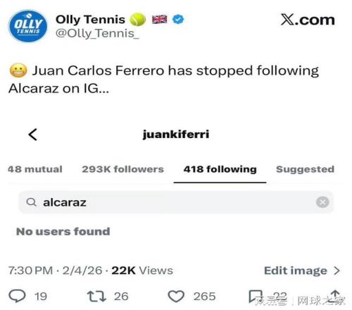 昨天,有網(wǎng)友注意到費(fèi)雷羅已在Instagram上取關(guān)了他曾經(jīng)的愛徒阿爾卡拉斯,這對(duì)備受矚目的師徒徹底分道揚(yáng)鑣,走向了故事里最令人唏噓的章節(jié)。它不再僅僅是網(wǎng)球圈內(nèi)一則尋常的流動(dòng)新聞,而是一場(chǎng)被置于聚光燈下的、體面與拉扯交織的漫長告別。職業(yè)網(wǎng)壇教練與球員間的聚散離合本如季節(jié)更替般尋常,但只因主角是那個(gè)來自穆爾西亞、被費(fèi)雷羅親手從璞玉雕琢成王者的阿爾卡拉斯,一切便有了不同的重量。如今,阿卡在墨爾本公園捧起澳網(wǎng)冠軍獎(jiǎng)杯,完成了全滿貫的偉業(yè),臉上的笑容是燦爛的。而他的成長之路上,那個(gè)最熟悉的身影已不在場(chǎng)邊。這輝煌的勝利,被許多人解讀為一個(gè)無聲的“獨(dú)立宣言”,背后卻是一個(gè)關(guān)乎成長、權(quán)力與最終和解的復(fù)雜敘事。